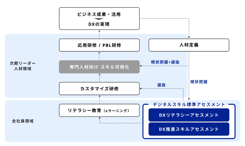 上記でご紹介しました「 デジタルスキル標準」の構成の一つである「DX リテラシー標準」に準拠した、 DX リテラシーアセスメントを用意しており、DX リテラシー教育を定量評価することができます。学んで終わりではなくしっかりとスキルが身についたかを定量評価をするアセスメントを活用する会社も増えてきております。