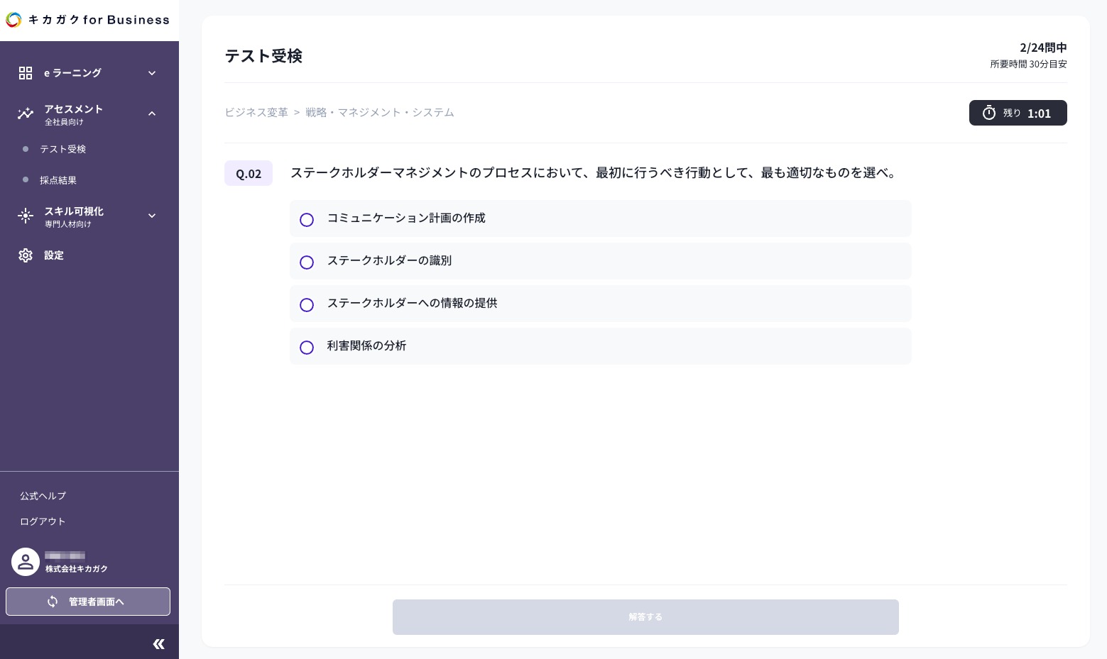 キカガクのDX 推進スキルアセスメントは、DX を推進する主な人材として選出された社員が、デジタルスキルを定量的に測定できるテストです。