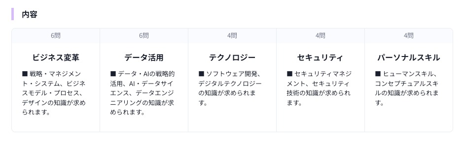テスト項目は、上記の DX 推進スキル標準のスキル項目にもとづき、次の 5 つの内容で実施します。