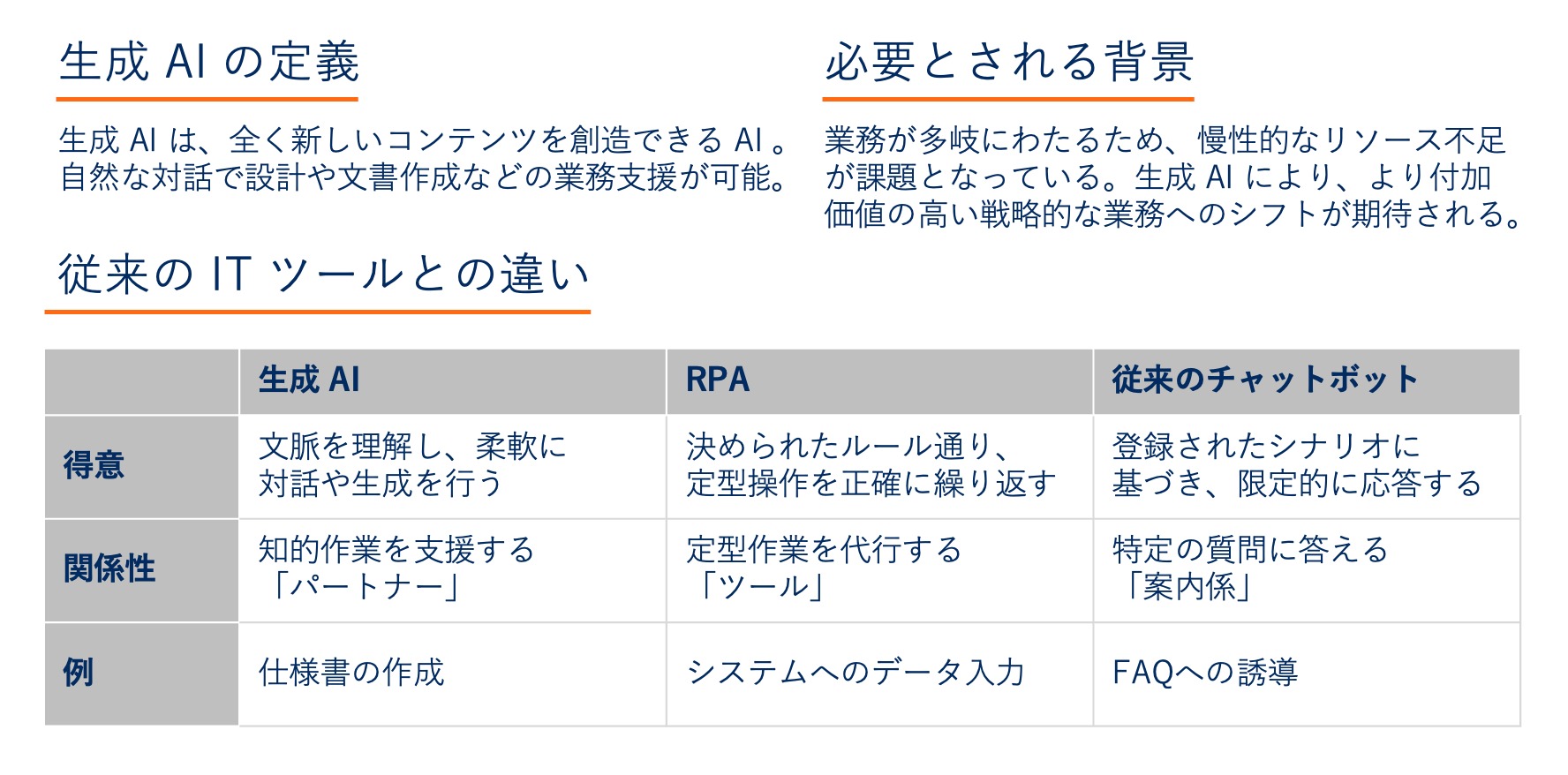 このように、生成 AI は単なる作業の代行ではなく、人間の思考をサポートし、より複雑で非定型な業務に対応できる点が大きな特徴です。