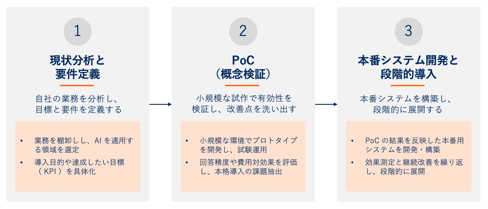 情報システム部門への生成 AI 導入を成功させるためには、計画的なアプローチが不可欠です。ここでは、失敗のリスクを最小限に抑え、効果を最大化するための3つのステップをご紹介します。