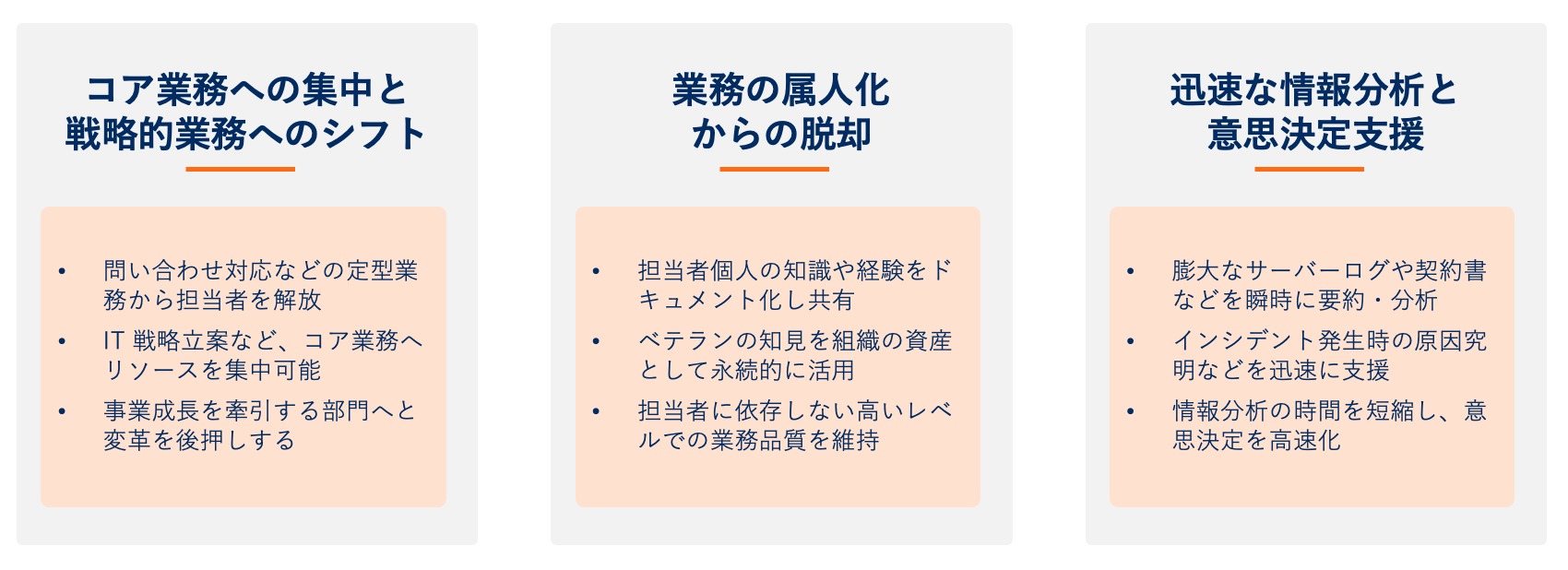 関係性 | 従業員の知的作業を | 人間の定型作業を | 特定の質問に |