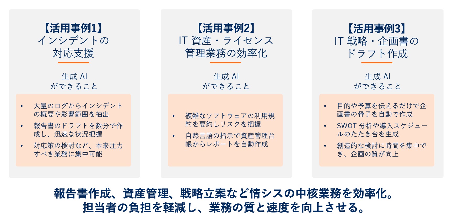 生成 AI は、すでに情報システム部門の様々な業務でその効果を発揮し始めています。ここでは「システム開発」の文脈を除き、情報システム部門の中核業務に焦点を当てた3つの活用事例をご紹介します。