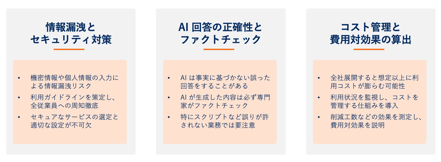 生成 AI の導入は多くのメリットをもたらしますが、成功させるためにはいくつかの注意点を理解しておく必要があります。