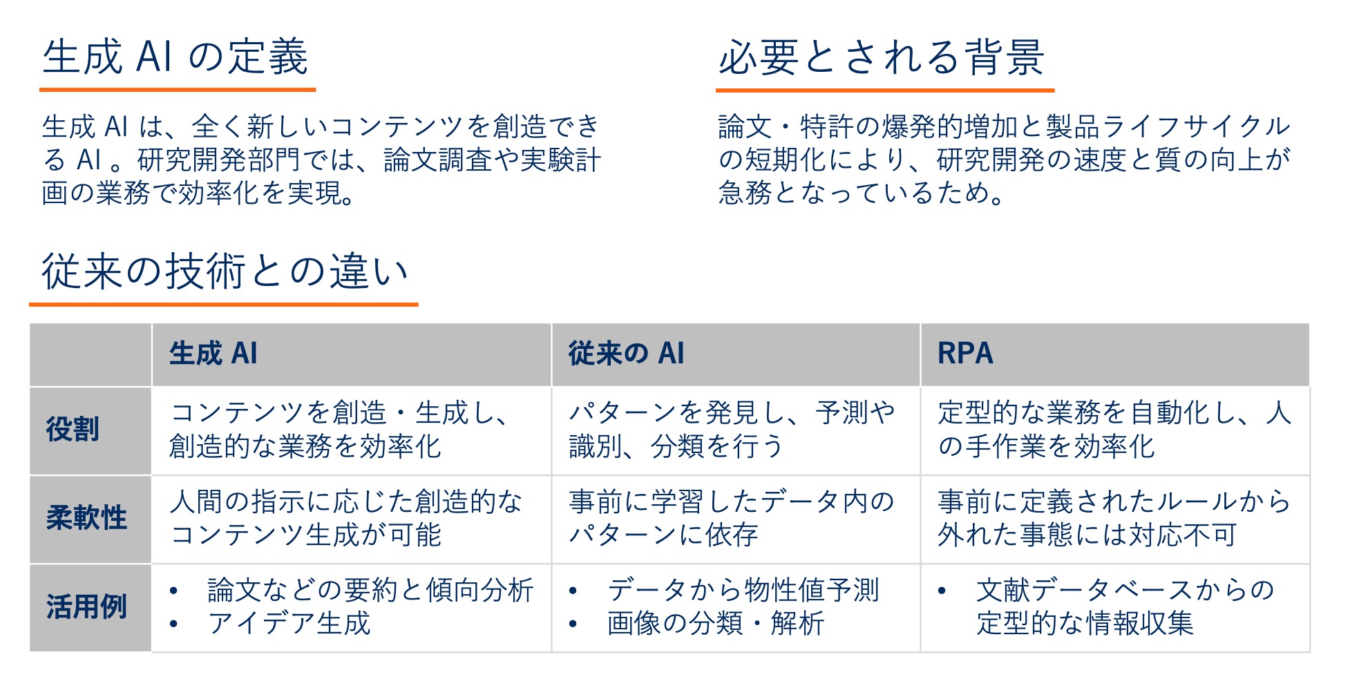 研究開発の現場で活用されてきた従来の技術と生成 AI は、その役割と柔軟性において明確な違いがあります。