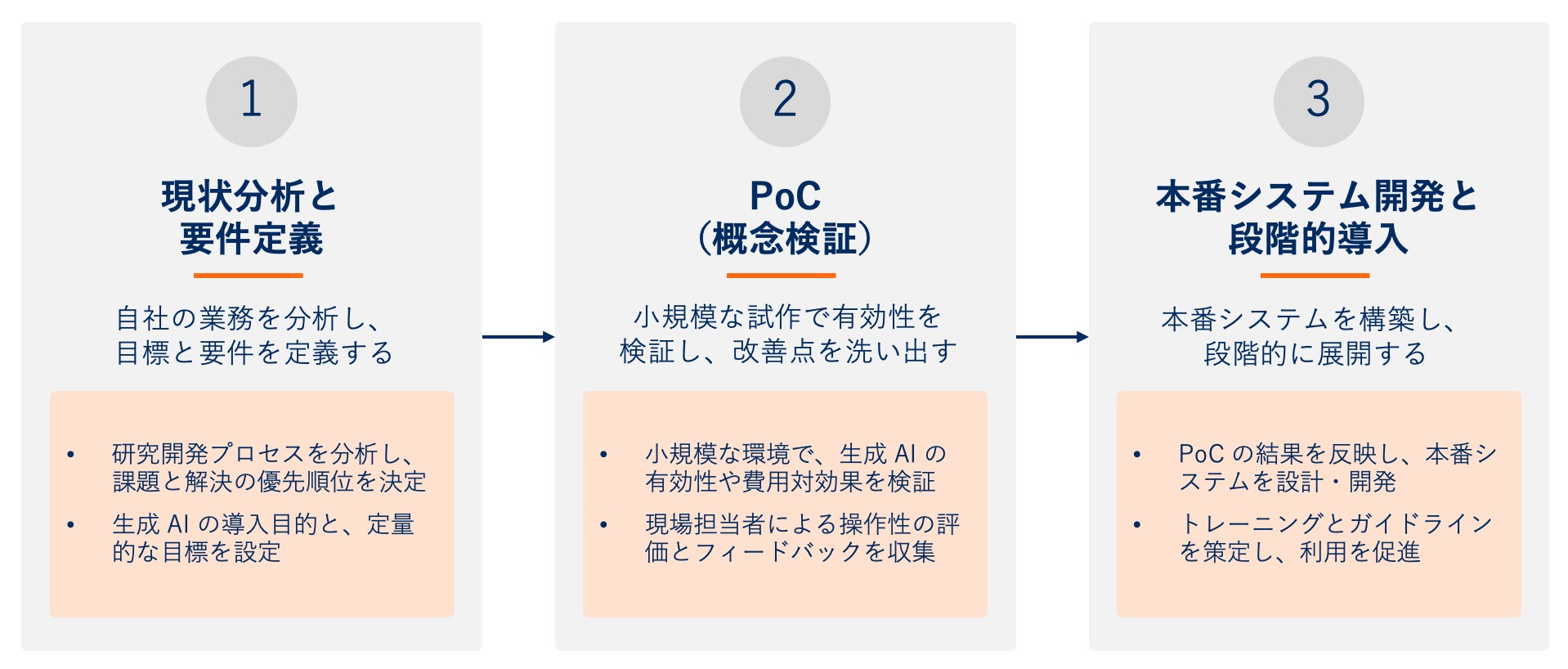 研究開発部門に生成 AI を導入する場合、どのような手順で進めればよいのでしょうか。ここでは、失敗リスクを最小化しながら効果的に導入を進めるための3つのステップをご紹介します。