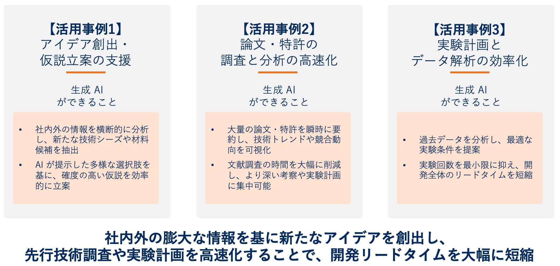 生成 AI は、研究開発の様々なフェーズでその能力を発揮します。ここでは代表的な3つの活用事例をご紹介します。