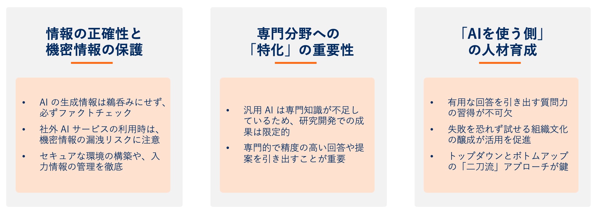 生成 AI を真に活用するためには、研究者自身が「AI にどのような質問を投げかければ、有用な答えが返ってくるか」というスキル(プロンプトエンジニアリング)を身につける必要があります。また、失敗を恐れずに新しいツールを試すことのできる組織文化の醸成も不可欠です。トップダウンでの導入推進と同時に、研究現場からのボトムアップでの活用アイデアを奨励する「二刀流のアプローチ」が、全社的な AI 活用を成功に導く鍵となります。