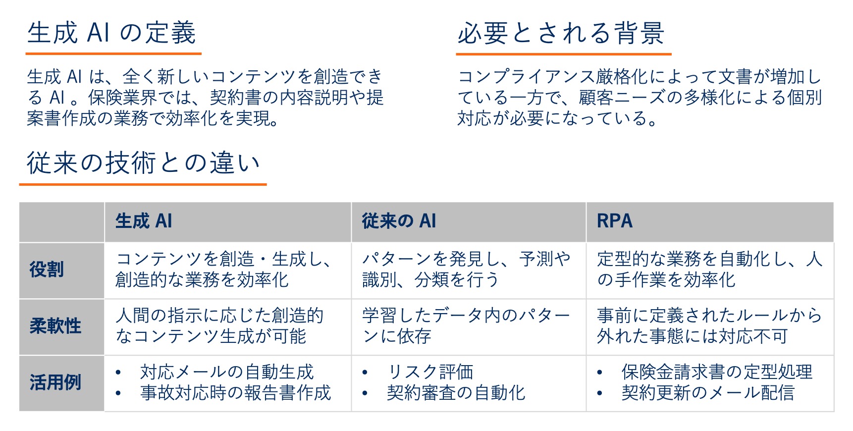 このように、従来の AI が特定の予測や分類業務に特化しているのに対し、生成 AI は保険業界の創造的な業務を支援し、高品質な文書やコンテンツを効率的に作成する役割を担います。