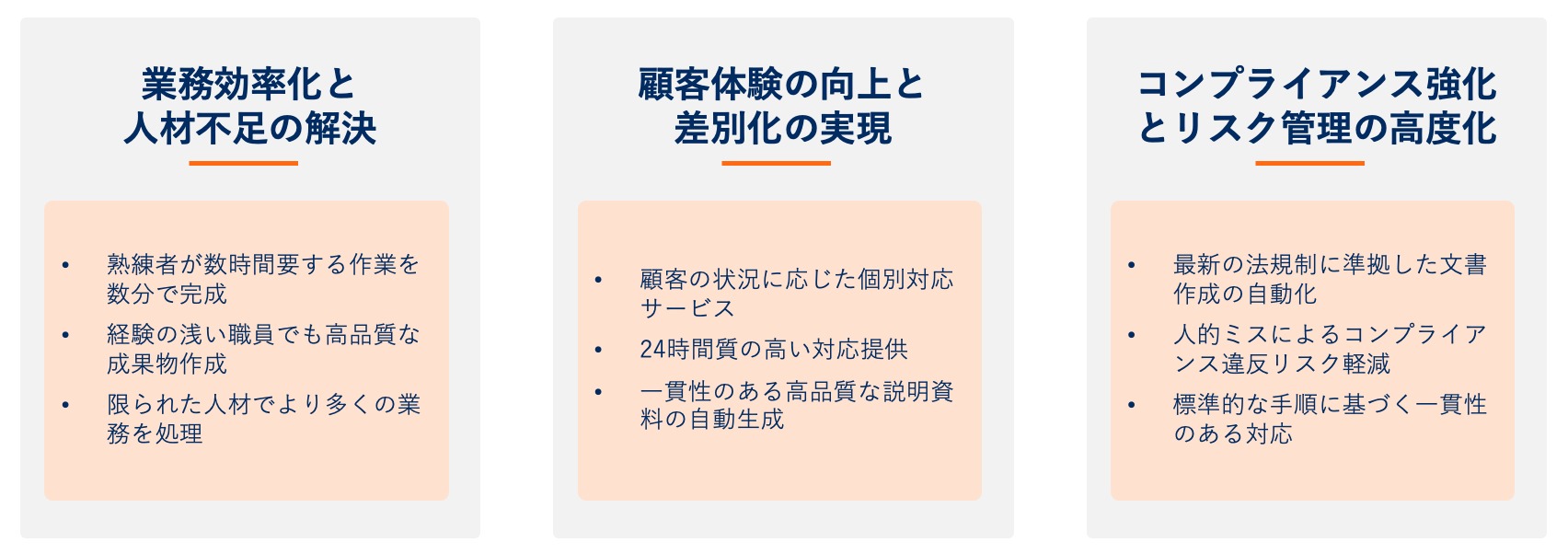 保険業界では、法令遵守と適切な情報管理が事業継続の前提条件となります。生成 AI を活用することで、最新の法規制に準拠した文書作成や、個人情報の適切な取り扱いを自動化できるため、人的ミスによるコンプライアンス違反のリスクを大幅に軽減できます。