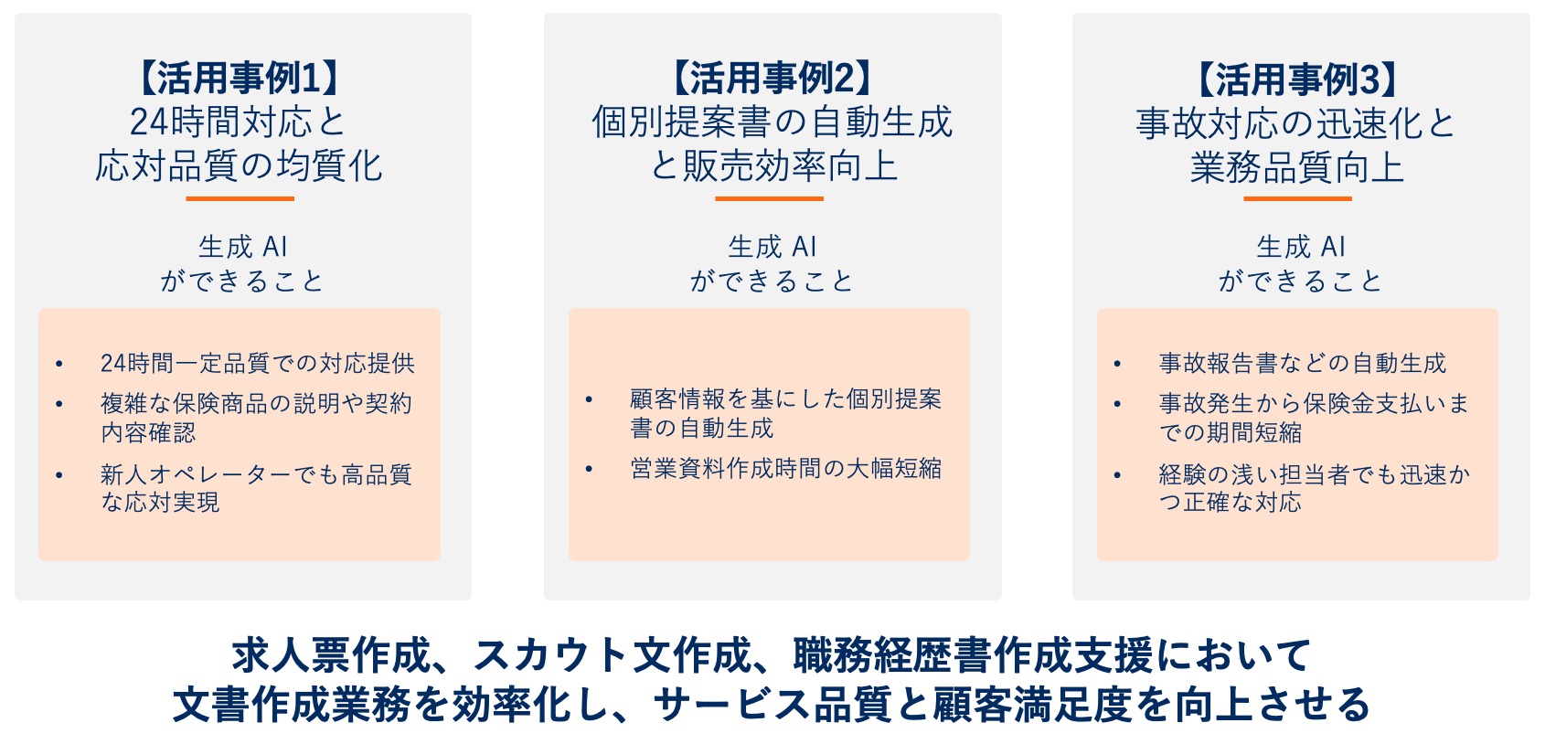 保険業界における生成 AI の活用は、すでに多くの保険会社で実証され、業務効率化と顧客サービス品質の向上を同時に実現しています。ここでは代表的な3つの活用事例をご紹介します。
