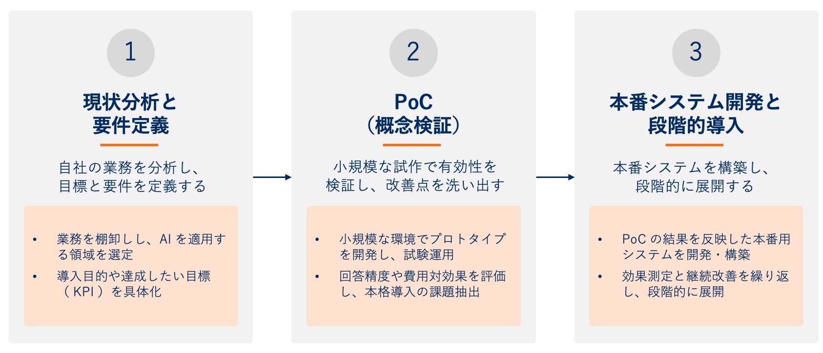 PoC の結果を踏まえ、本格運用に耐えうる生成 AI システムを構築し、段階的に業務に組み込む