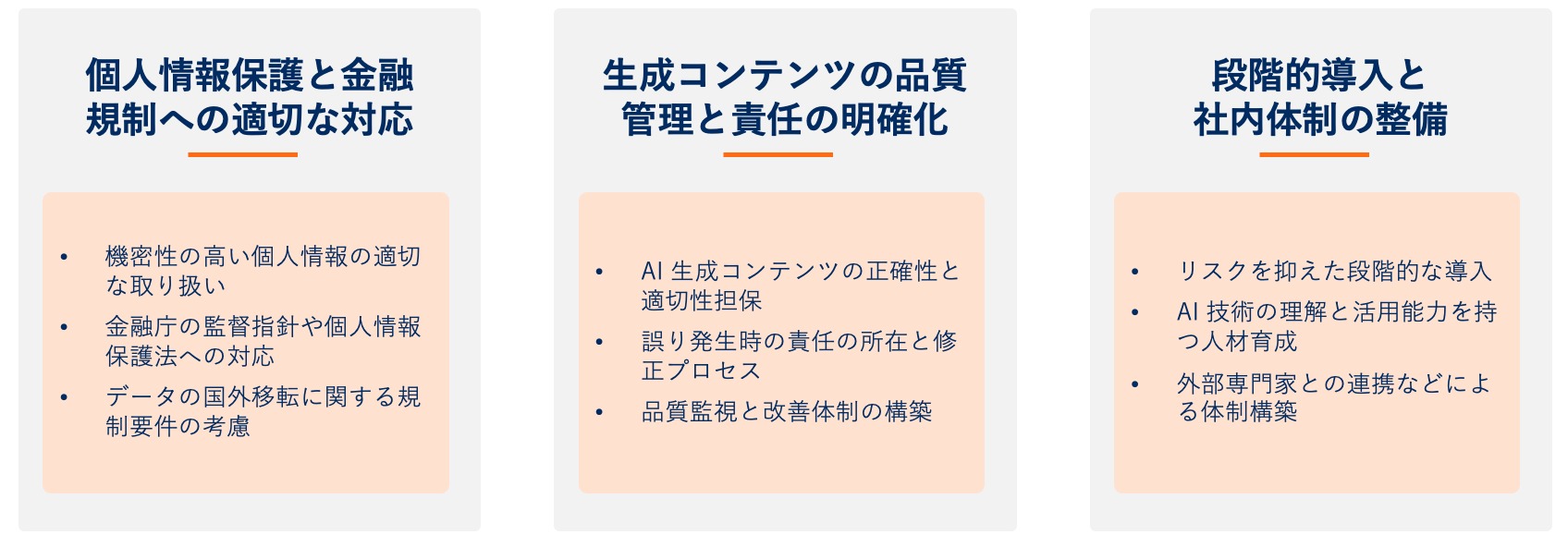 保険商品の説明や契約内容に関わる情報は、顧客の重要な意思決定に影響を与えるため、生成 AI による出力内容の正確性と適切性を担保する仕組みが必要です。 AI が生成した文章に誤りがあった場合の責任の所在や、修正プロセスを明確に定義し、必要に応じて人間による最終チェックを組み込むことが重要です。