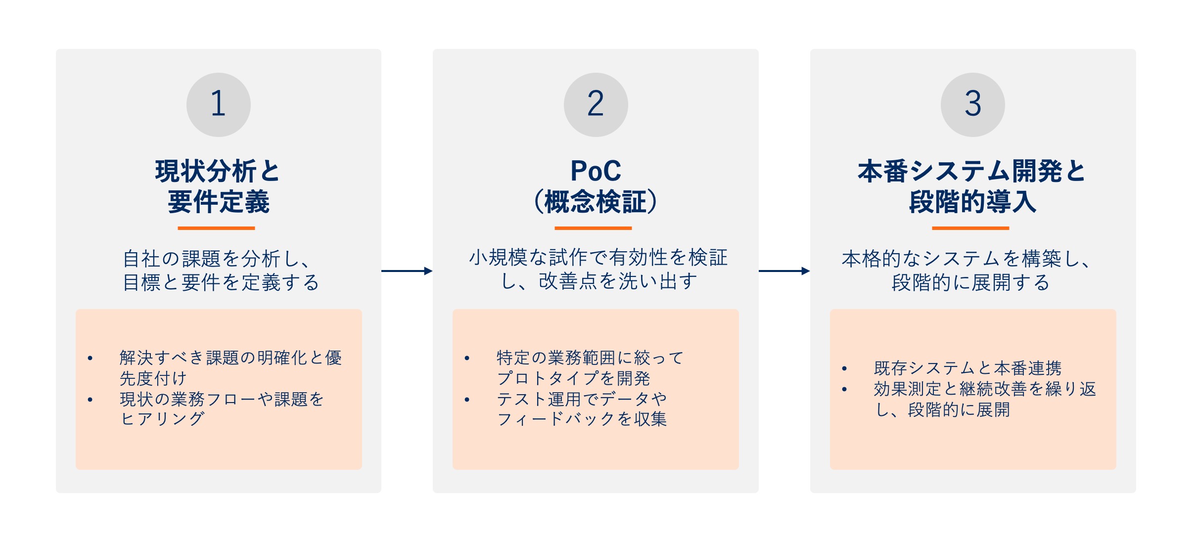 教育現場への AI エージェント導入を成功させるためには、段階的かつ計画的なアプローチが不可欠です。ここでは、失敗リスクを最小化し、効果的に導入を進めるための3つのステップをご紹介します。