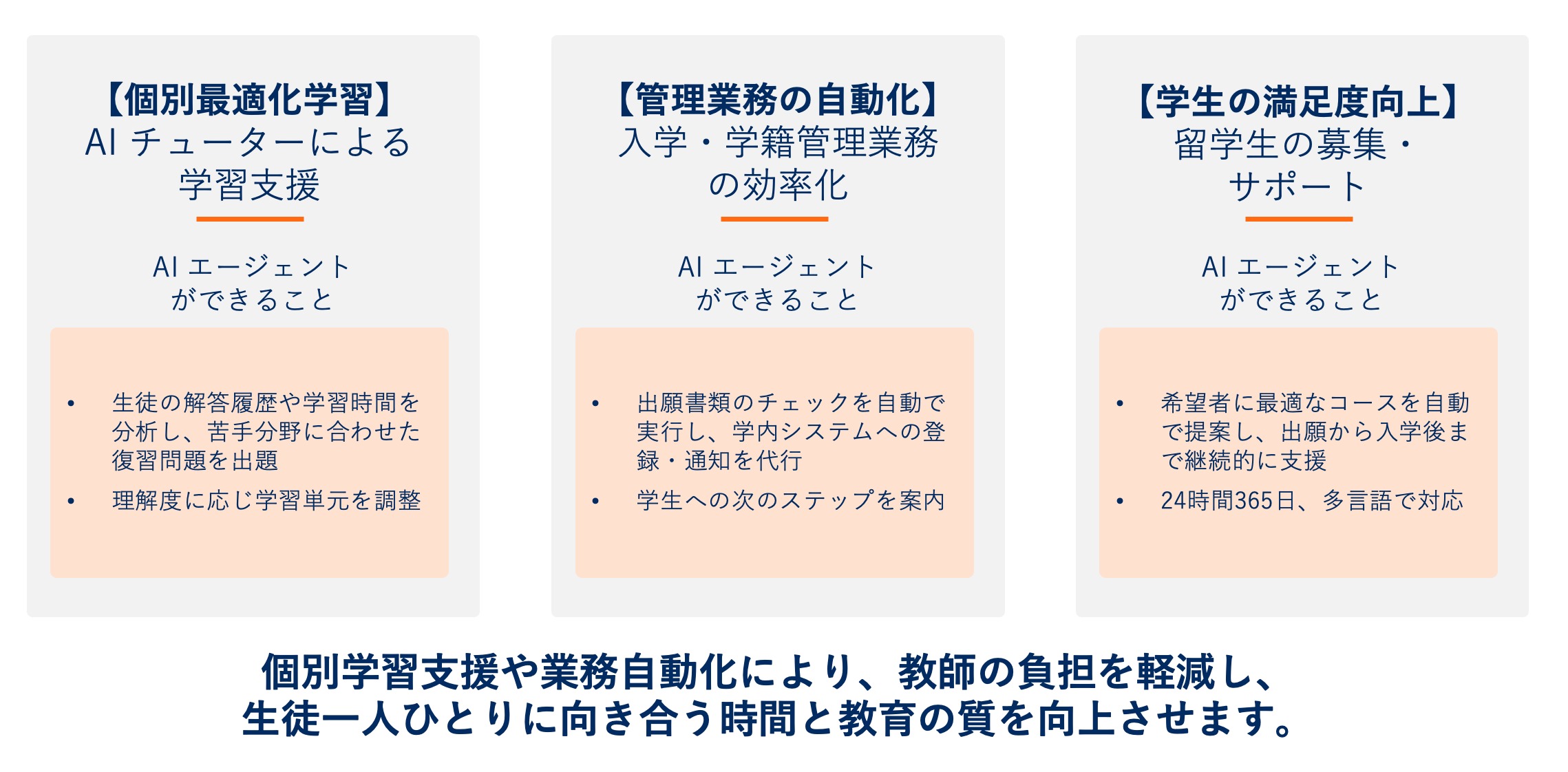 AI エージェントは、こうした課題を解決する有効な手段として注目されています。例えば、AI エージェントが生徒からの質問対応や小テストの採点などを自動化することで、教師は生徒との対話や、より創造的な授業の準備に時間を充てられるようになります。また、生徒一人ひとりのデータを分析し、個別最適化された学習プランを提供することで、学習効果の最大化にも貢献します。