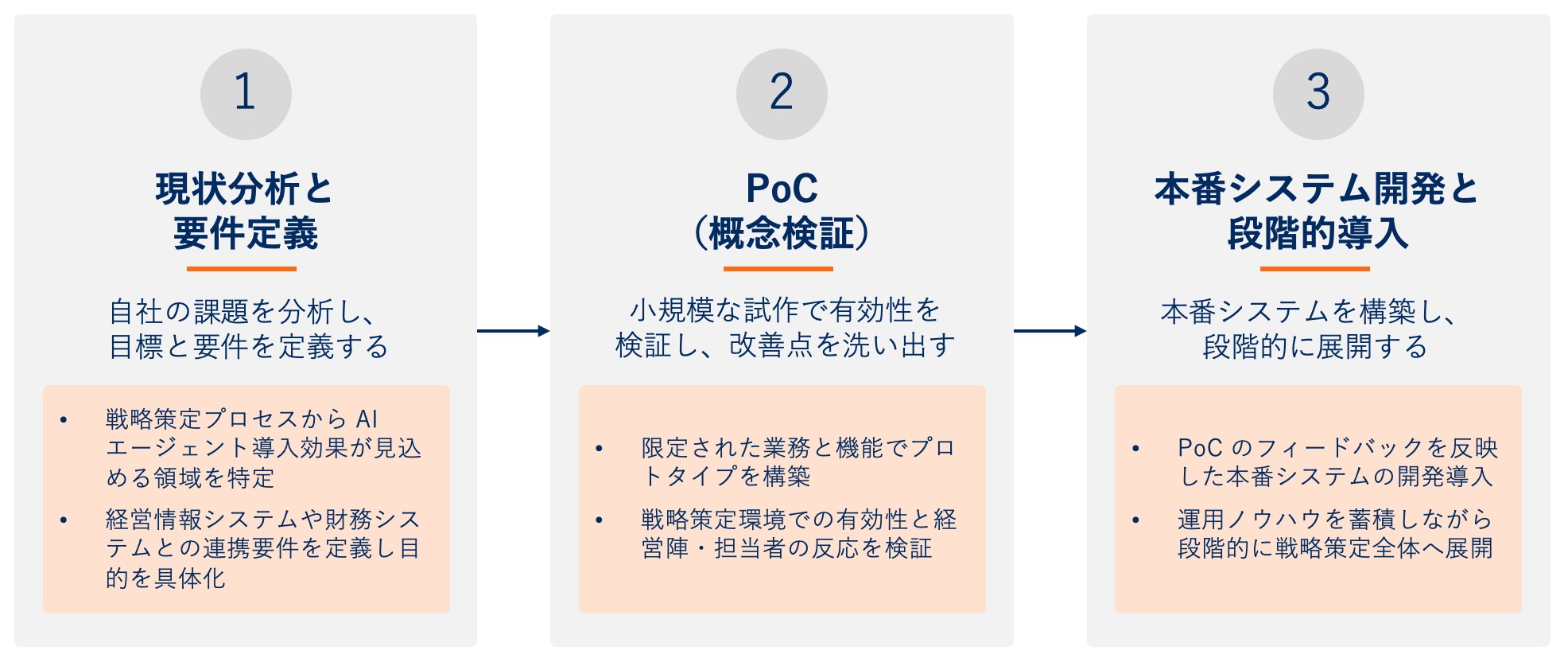 経営企画部門への AI エージェント導入は、戦略策定プロセスの複雑さと経営判断への直接的な影響を考慮し、段階的で慎重なアプローチが求められます。ここでは、経営陣からの信頼を維持しながら、効果を最大化するための3つのステップをご紹介します。