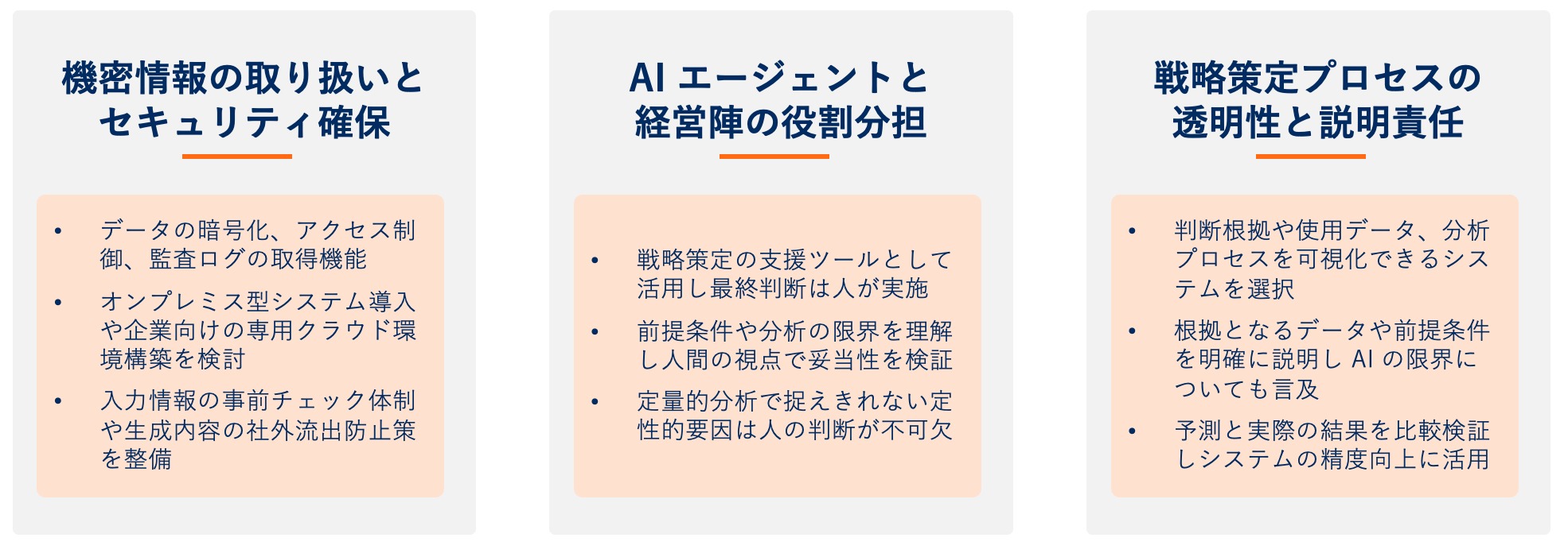 AI エージェントの分析結果を盲信することなく、その前提条件や分析の限界を理解し、人間の視点で妥当性を検証することが必要です。特に、定量的な分析では捉えきれない定性的な要因(企業文化、社員のモチベーション、取引先との関係性など)については、人間の判断が不可欠です。また、 AI エージェントが生成する戦略案について、実行可能性や組織への影響を慎重に検討し、必要に応じて修正や調整を行うことも重要です。