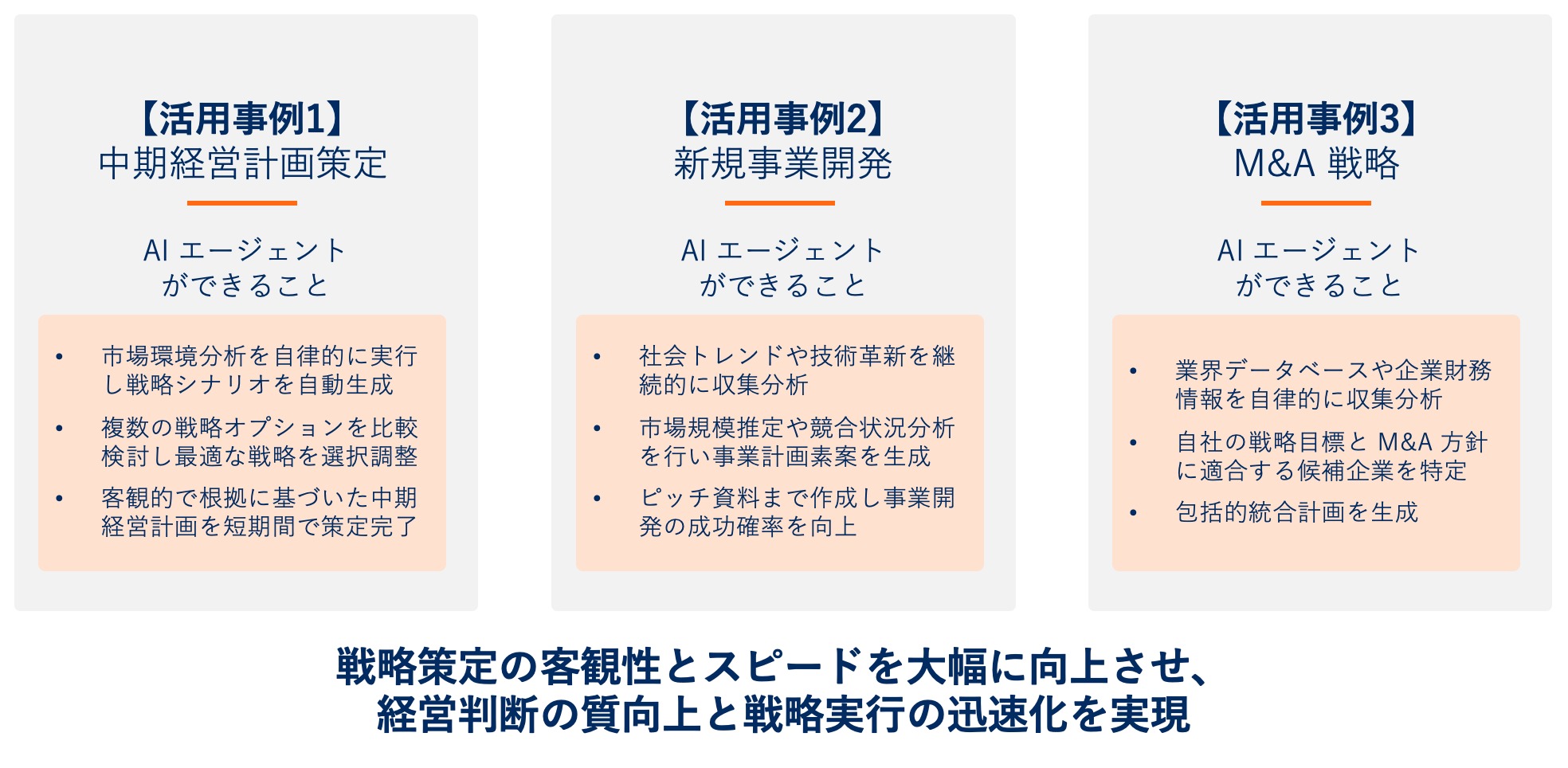 AI エージェントシステムでは、「来年度の中期経営計画を策定したい」という指示に対して、自律的に業界レポート、競合他社の財務情報、特許情報、規制動向、技術トレンドなどの外部情報を収集し、社内の売上データ、顧客フィードバック、製品開発状況と統合して分析します。 AI エージェントが市場機会の特定、競合脅威の分析、自社の事業ポートフォリオ評価を行い、複数の戦略シナリオを生成し、さらにプレゼンテーション資料まで自動作成します。経営企画担当者は、 AI エージェントが生成した戦略オプションを比較検討し、最適な戦略を選択・調整することで、より客観的で根拠に基づいた中期経営計画を短期間で策定できるようになりました。