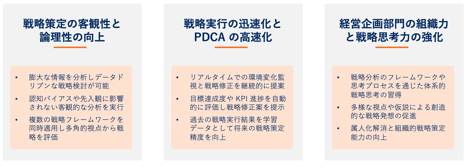 AI エージェントの活用により、経営企画部門全体の組織力と戦略思考力の底上げが期待できます。従来は限られたベテラン担当者のみが高度な戦略分析を行っていましたが、 AI エージェントの支援により若手社員でも質の高い戦略分析が可能になります。