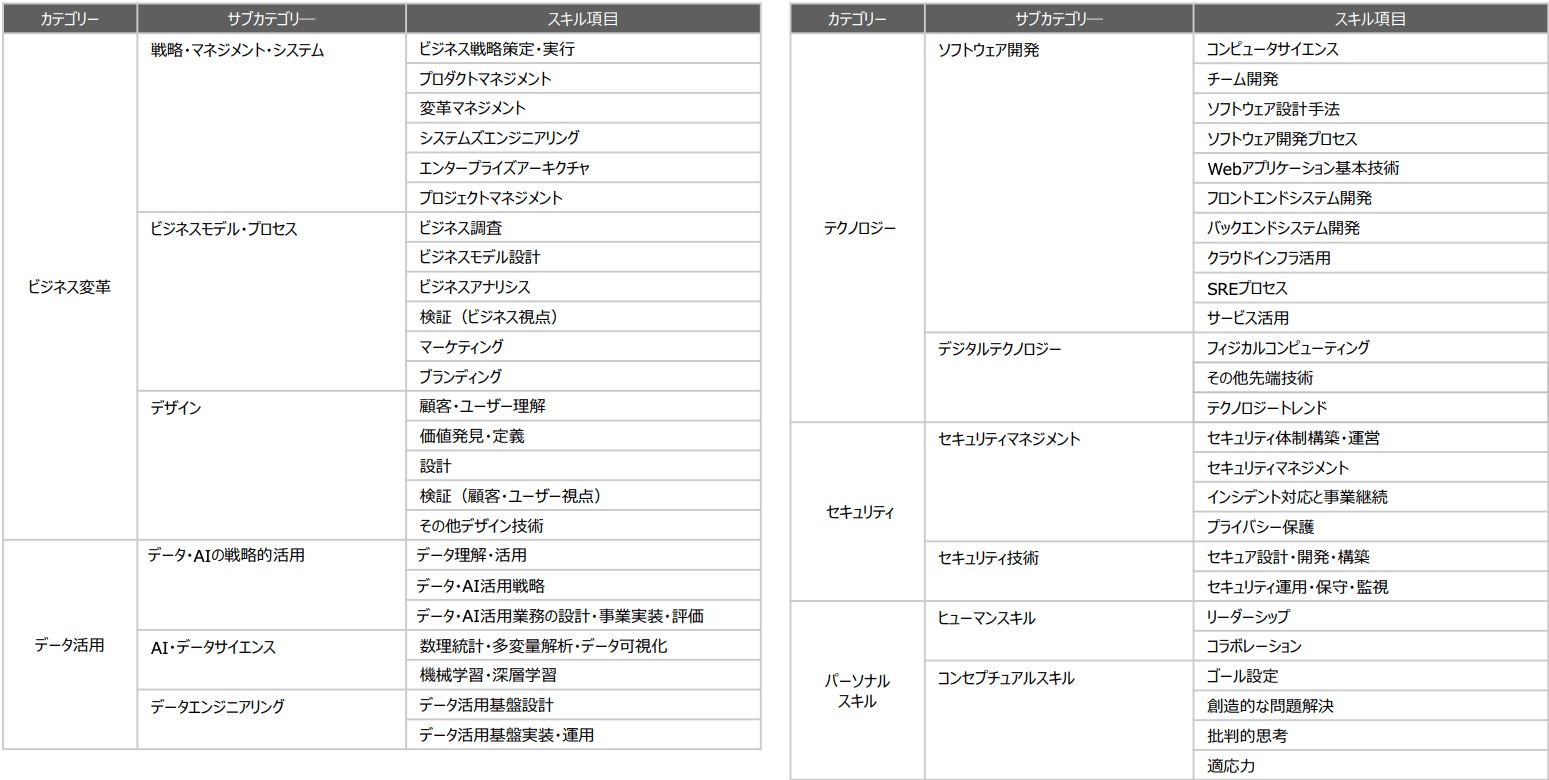 こちらは経済産業省が定義した「デジタルスキル標準」の共通スキルリストです。前章で 5 つの人材類型について紹介いたしましたが、その人材類型全てに共通するスキルがあります。必要なスキルが細かく設定されているのと、事例を交えて紹介しているのでぜひご参考ください。