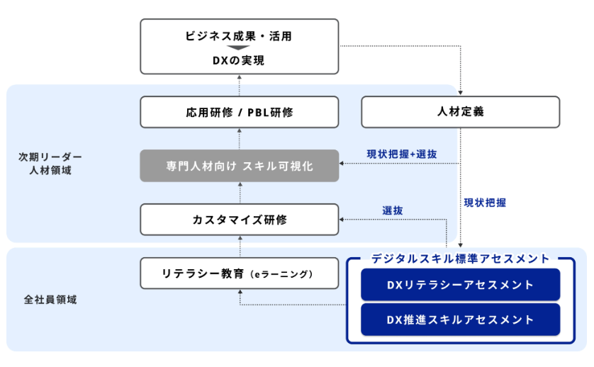上記でご紹介しました「 デジタルスキル標準」の構成の一つである「DX リテラシー標準」に準拠した、 DX リテラシーアセスメントを用意しており、DX リテラシー教育を定量評価することができます。学んで終わりではなくしっかりとスキルが身についたかを定量評価をするアセスメントを活用する会社も増えてきております。