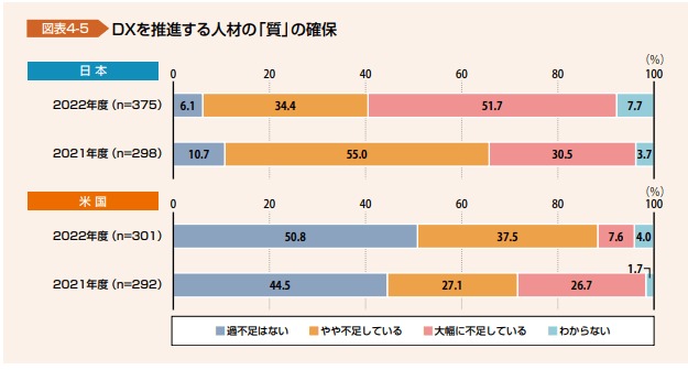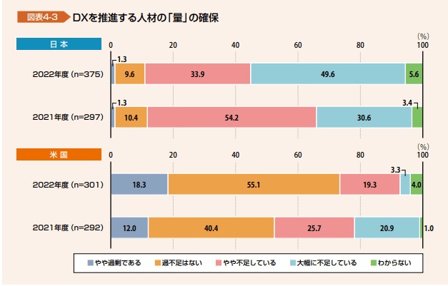 以下の画像は、日本と米国との「DX を推進する人材の「量」の確保」について集計したデータですが、日本にて DX 推進する人材が不足していると感じている割合が 80 % 以上と米国と比較してもかなり高いことが分かります。