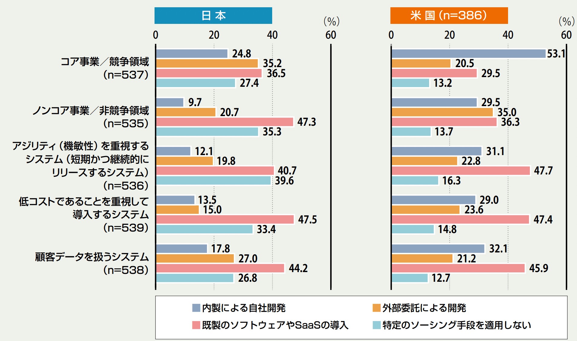 上図は日本と米国での外部リソースの活用方法の違いについて記載されていますが、アメリカでは「コア事業/競争領域」にて 50 % 以上を内製化しており、日本においては 約 25 % しか内製が進んでおらず、外部委託に依存していることが分かります。
