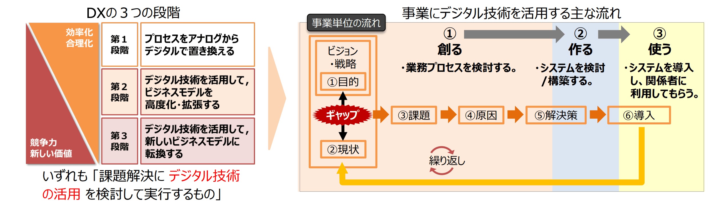 「デジタル技術の活用」を起点としてしまうと、単なる業務改善や効率化に終始してしまうため、目的と 現状のギャップ を課題と位置づけ、それを解決するというビジネス起点の考え方で新たな価値の創出を 目指す。 |