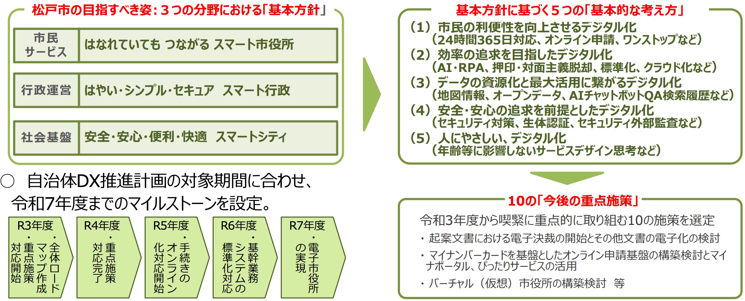 この事例では、「行政デジタル化ビジョン」に基づいて、目指すべき姿としての 3 つの「基本方針」に基づき、分野ごとの方向性を 5 つの「基本的な考え方」に分類。その実現に向けた具体的な施策を 10 の「今後の重点施策」として整理しています。