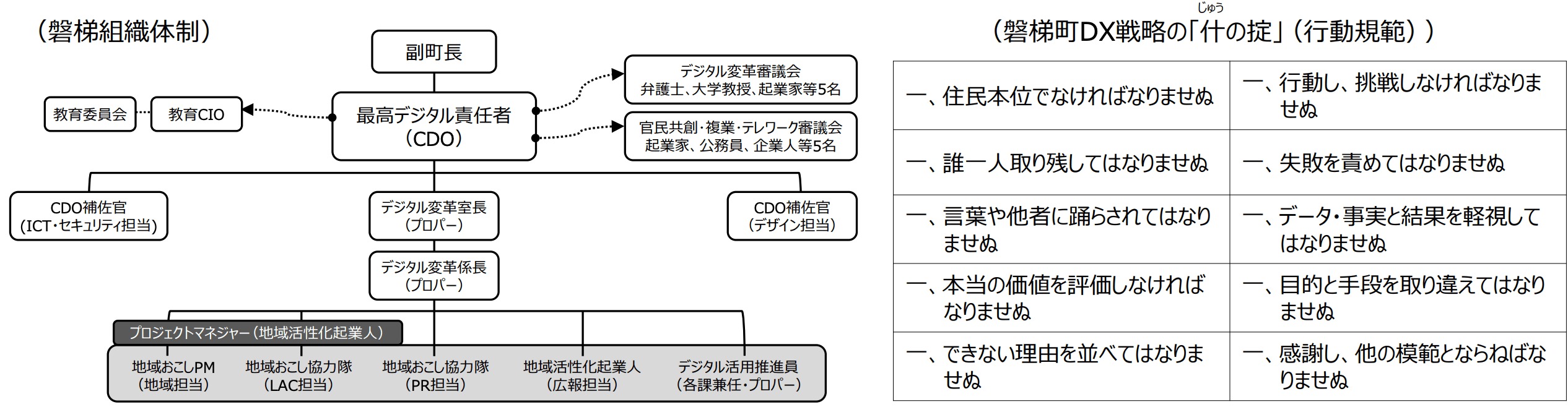 この事例では、仕組みを変えずして、全庁一丸となってデジタル変革に取り組んでいくことは極めて困難と考え、副町長の直下に全庁・横断的なDX推進担当組織としてデジタル変革戦略室を設置し、CDO、CDO 補佐官(ICT,セキュリティ担当・デザイン担当)、地域プロジェクトマネージャー、地域活性化起業人及び地域おこし協力隊として外部人材を迎え入れ、DX を強力に推進し、複数の外部人材とも円滑に業務を行うことができるよう完全オンライン、ペーパーレス、リモートを前提とする組織に体制整備を行っております。