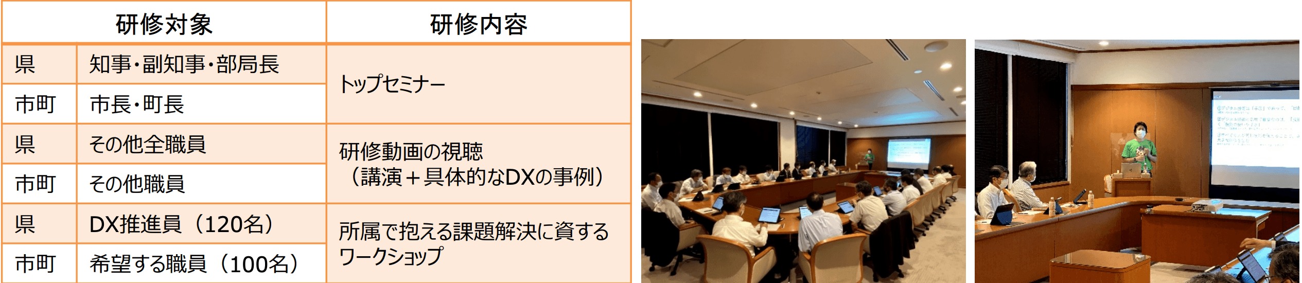 この事例では、県が自治体 DX 支援に実績のある企業と連携し、それぞれの役職に応じた研修を実施しています。首長、知事に対してのトップセミナー、全職員向けに講演と具体的な DX の事例紹介を行い、DX 推進委員には所属で抱える課題解決に対するワークショップを実施し、DX 推進に取り組んでおります。