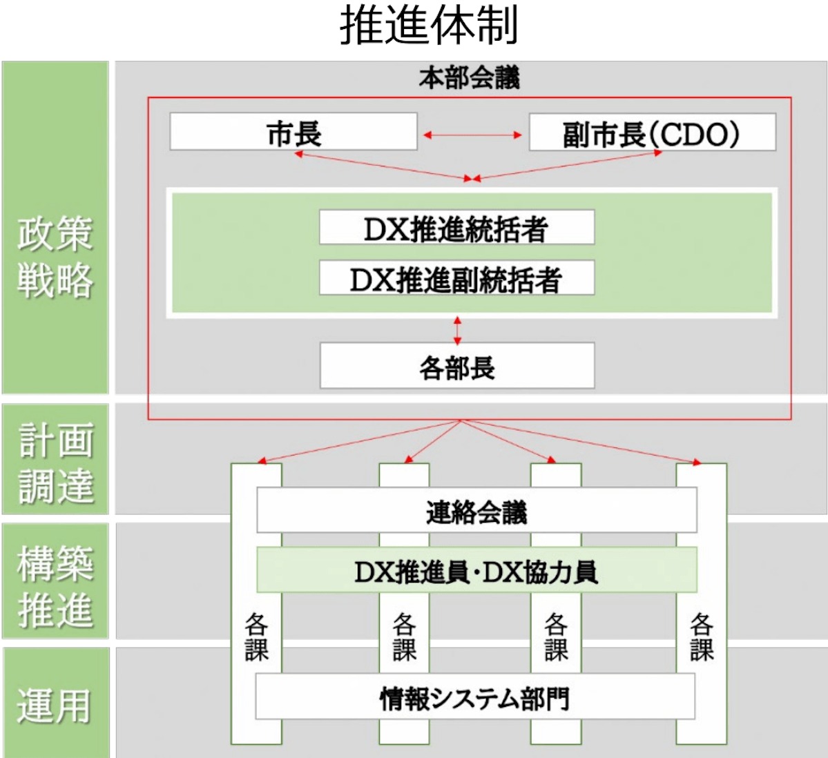 全庁的・横断的な推進体制の構築。DXの司令塔として、DX推進担当部門を設置し、 各業務担当部門をはじめ各部門と緊密に連携する体制を構築 |