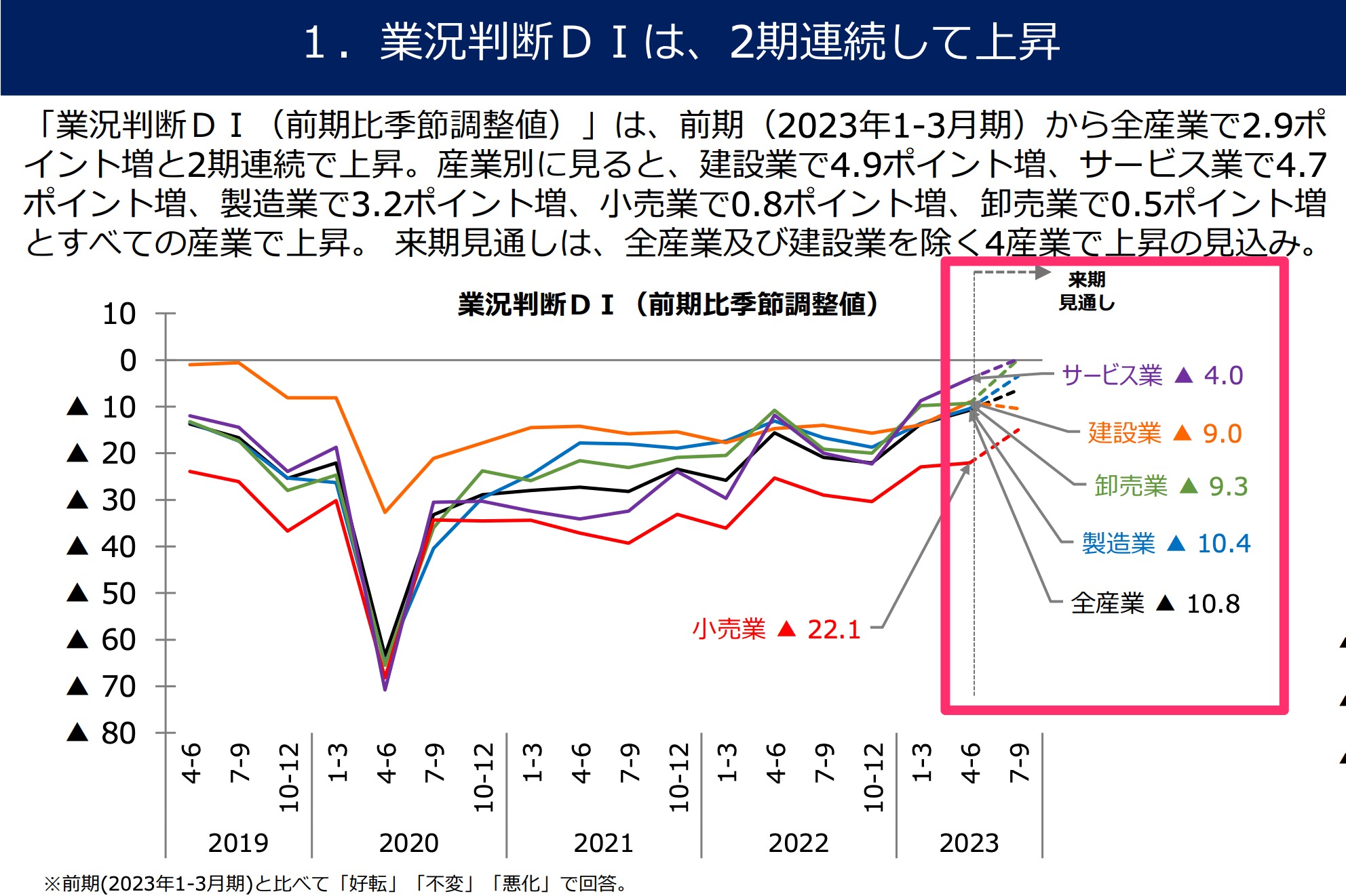 上図を見ていただくと分かる通り、コロナ禍と比べると業況は全ての産業で上昇しており、徐々に回復傾向であることが見て取れます。他にも、原材料・商品仕入単価は過去最高水準を維持していたり、売上単価・客単価も全体的に上昇基調を継続しており、中小企業においても価格転嫁が進んでいると考えられます。