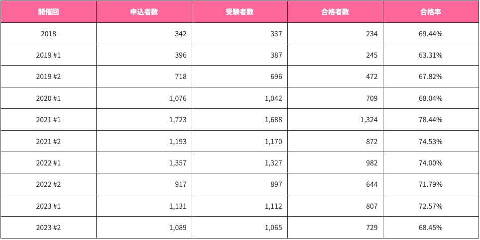 以下はこれまでの開催回別の合格率の一覧です。