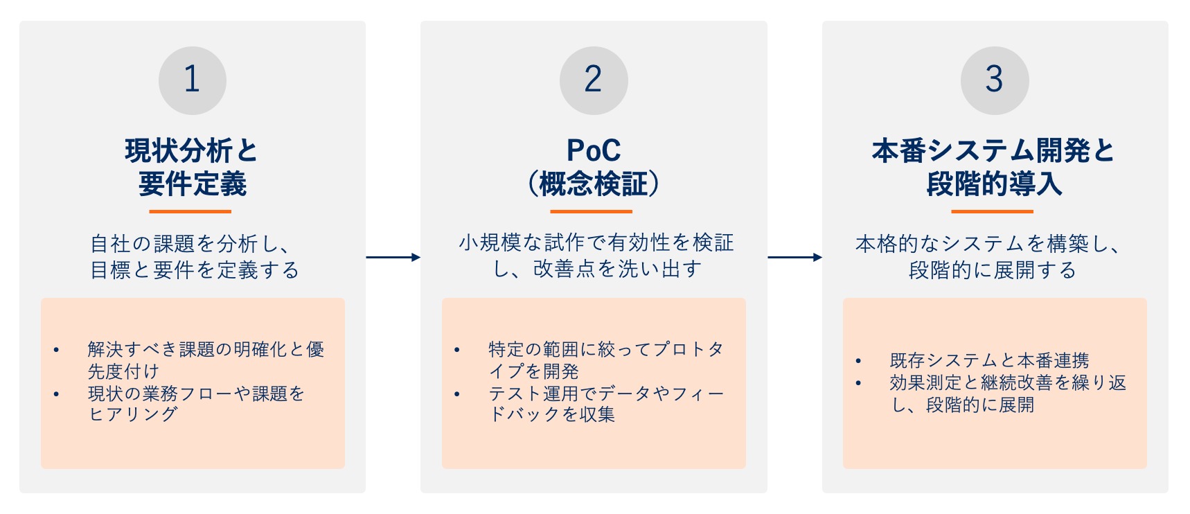 AI エージェントの導入を決定した場合、どのような手順で進めればよいのでしょうか。ここでは、企業のカスタマーサポート課題に応じたカスタムソリューション開発を前提とした、失敗リスクを最小化しながら効果的に導入を進めるための3つのステップをご紹介します。