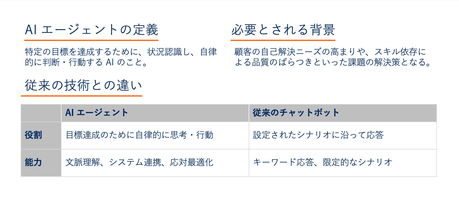 役割 | 目標達成のために自律的に | あらかじめ設定されたシナリオ |