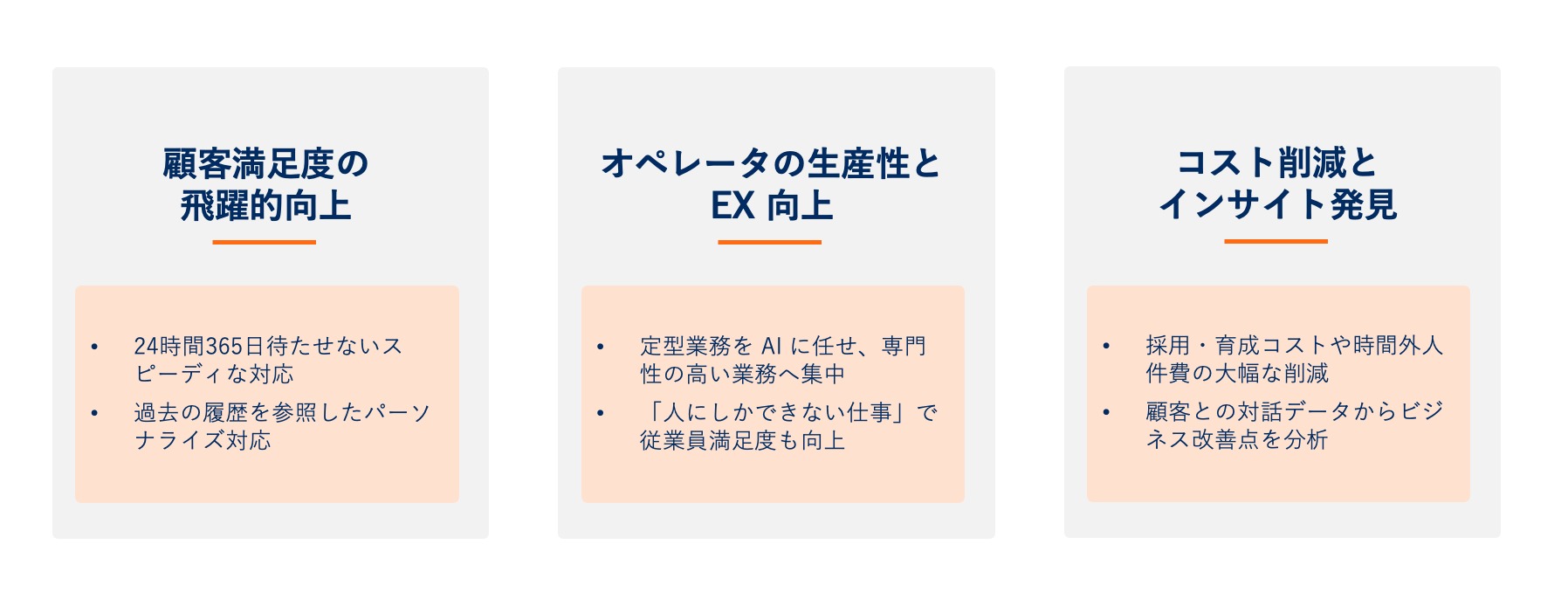 定型的な問い合わせや単純作業を AI エージェントに任せることで、オペレータはより専門性が高く、共感が求められる複雑な問題に集中できます。これにより、オペレータ一人ひとりの生産性が向上するだけでなく、「人間にしかできない価値ある仕事」に注力できるため、仕事への満足度やエンゲージメント( EX )の向上にも繋がります。