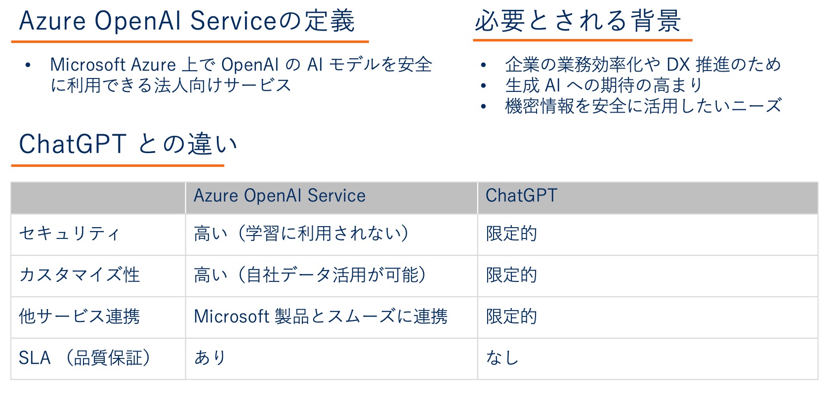 最も大きな違いは、セキュリティとカスタマイズ性です。 Azure OpenAI Service は、企業が自社のデータを安全に、かつ最大限に活用して、ビジネスに特化した AI ソリューションを構築するためのサービスと言えます。