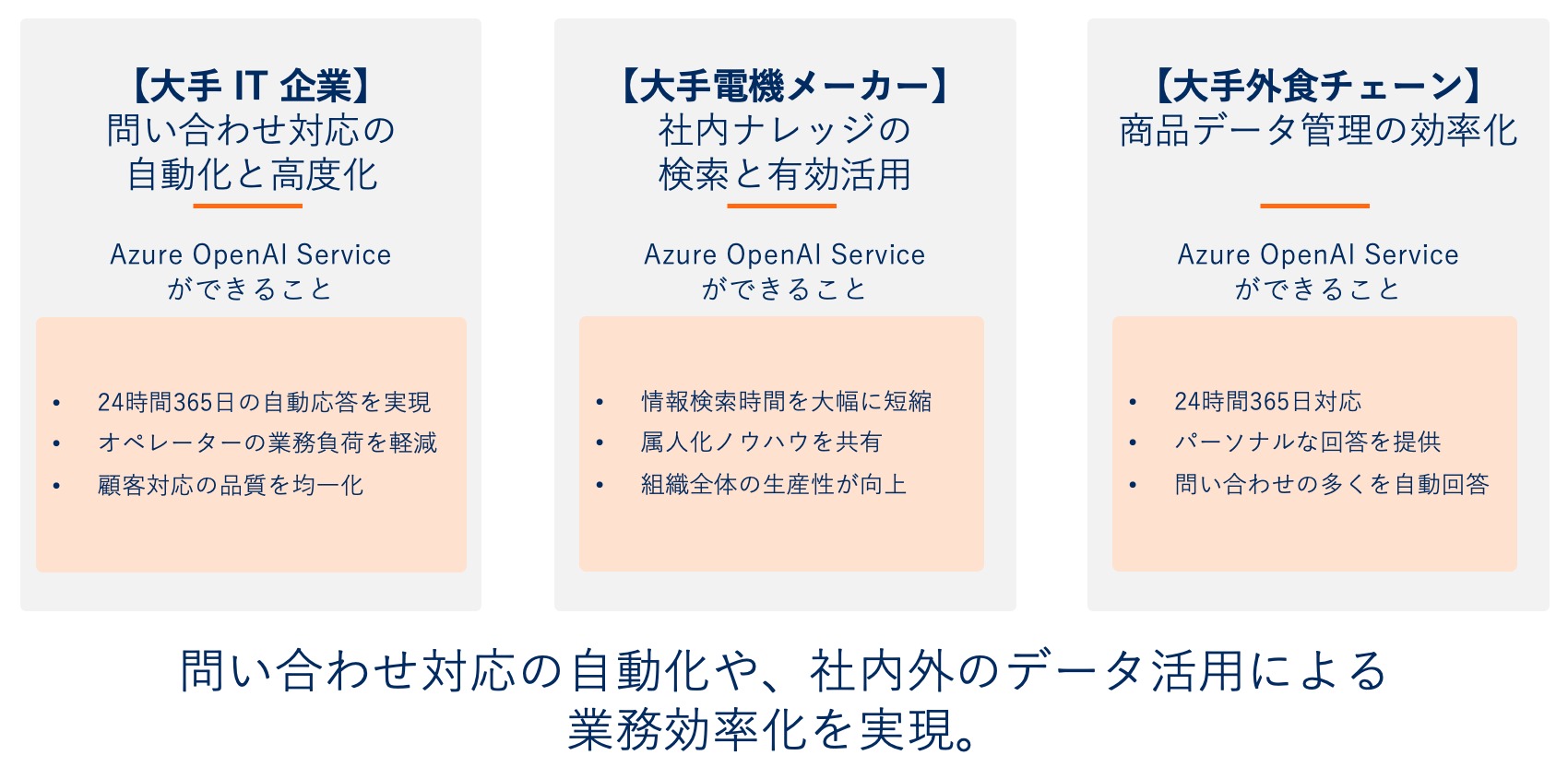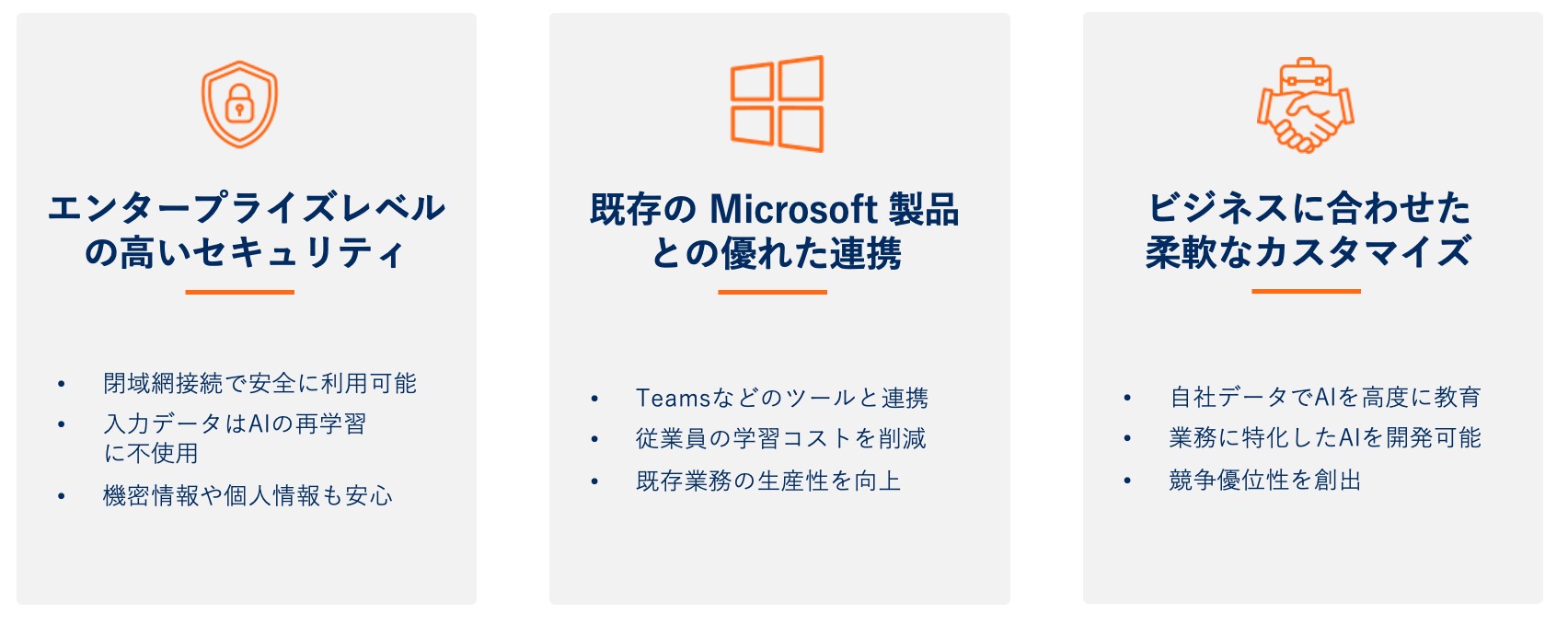 活用事例からもわかるように、 Azure OpenAI Service の導入は企業に多くのメリットをもたらします。特にご担当者様が知っておくべき3つの利点をご紹介します。