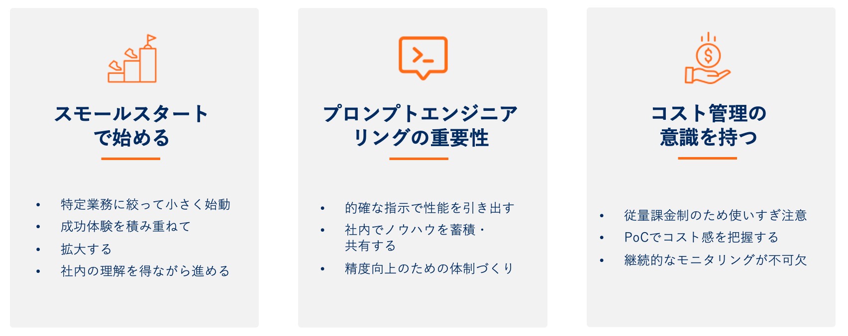 導入を成功させる鍵は、スモールスタートで成功体験を積み重ね、自社に合った活用法を見極めていくことです。この記事が、貴社の AI 活用推進の一助となれば幸いです。