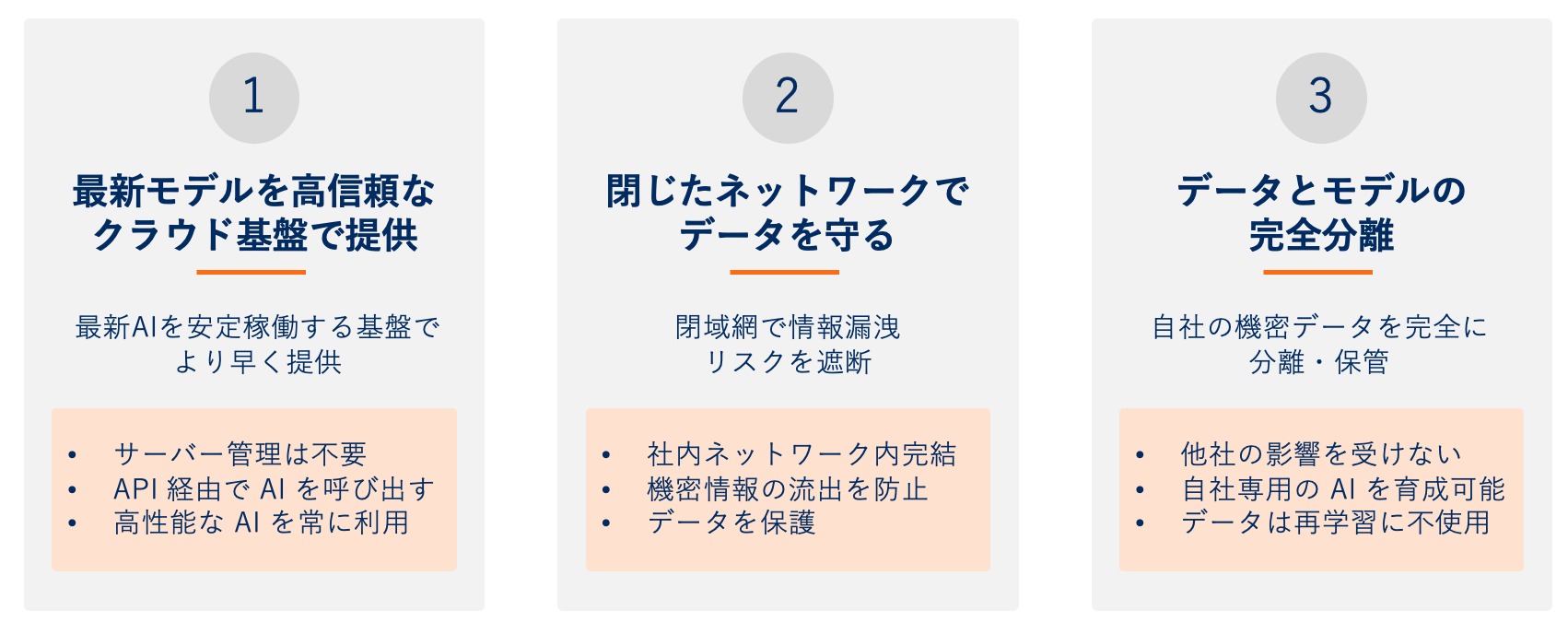 これらの仕組みにより、企業は「高性能」「高セキュリティ」「高い拡張性」を同時に享受し、安心して自社ビジネスにAIを組み込むことができるのです。