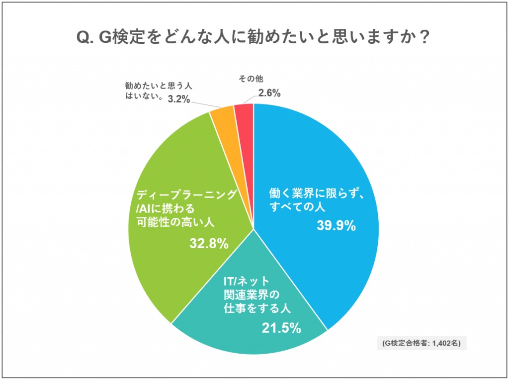 JDLA の「G検定を誰に勧めたいか」という調査によると、下図のようにほとんどの方は「取得を勧めたい」という結果になりました。また IT や AI に関わる人でない方を選んだ方も全体の約 40 %に達しました。