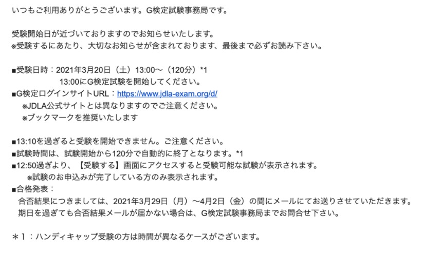 私の場合は、3/20 に受験し、その約 10 日後 4/1 の 13 時にメールにて通知がありました。