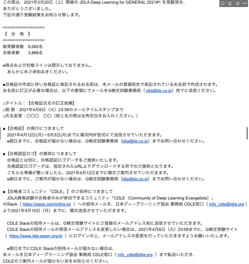 上記画像にあるように、受験者数や合格者数、合格者には合格証の発行や、合格者コミュニティへの招待が届きます。