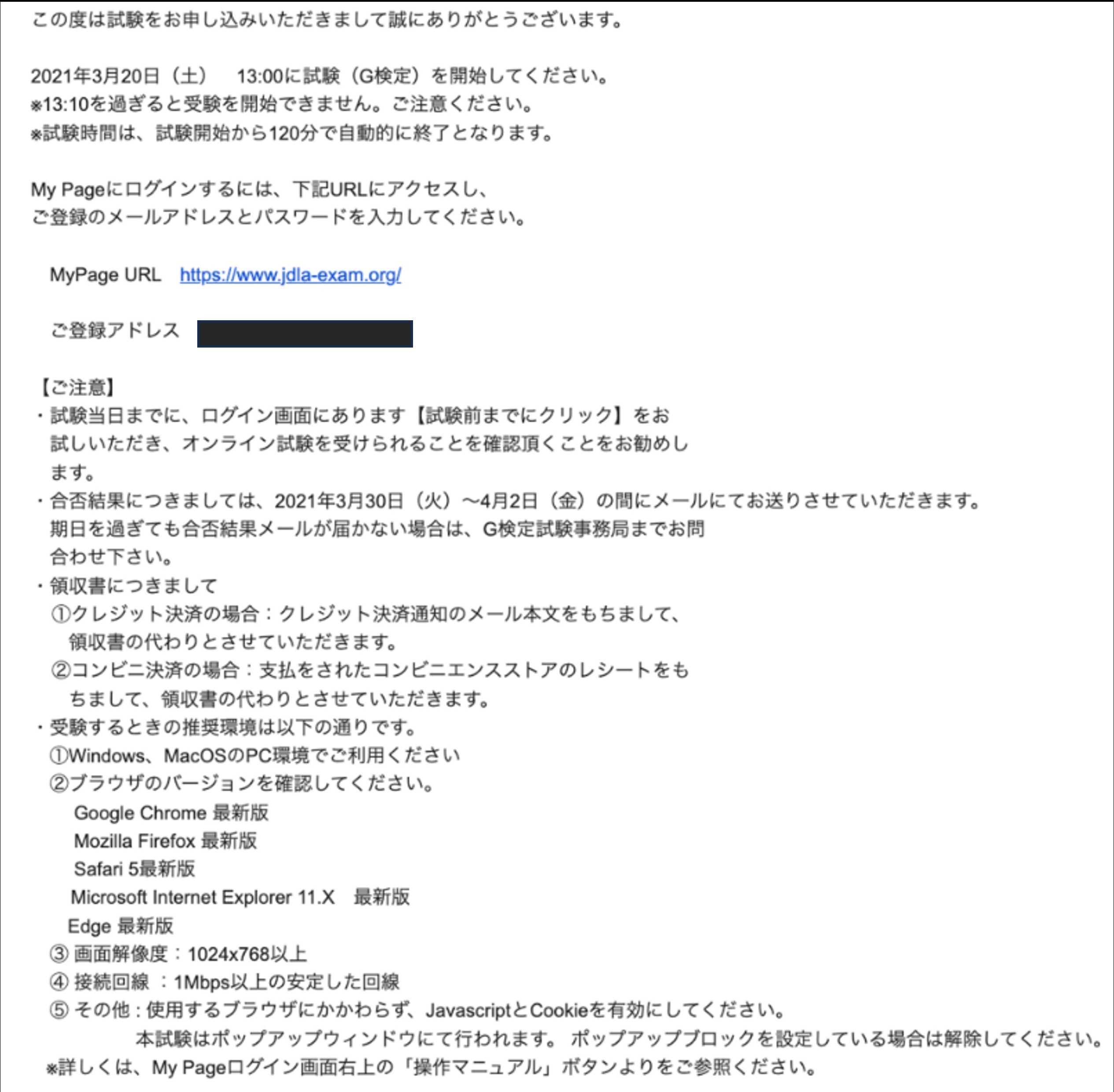 My Page から受験の申し込みを完了させると、次のようなメールが届きます