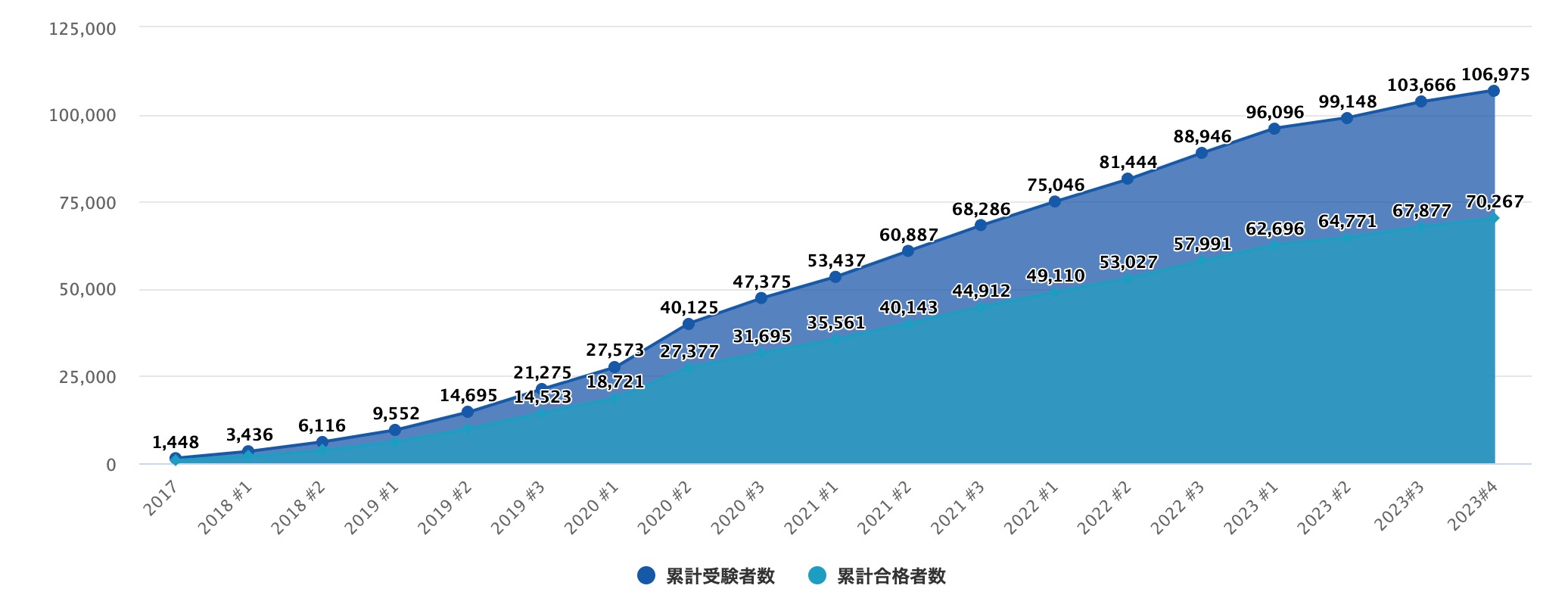 2023 年の 9 月までの受験者数と合格者数になります。2023年第4回実績だと、受験者数は3,309名。そのうち合格者数は2,390名、合格率は72.23%という結果になりました。これにより、G検定の累計受験者数は106,975名、累計合格者数は70,267名になりました。