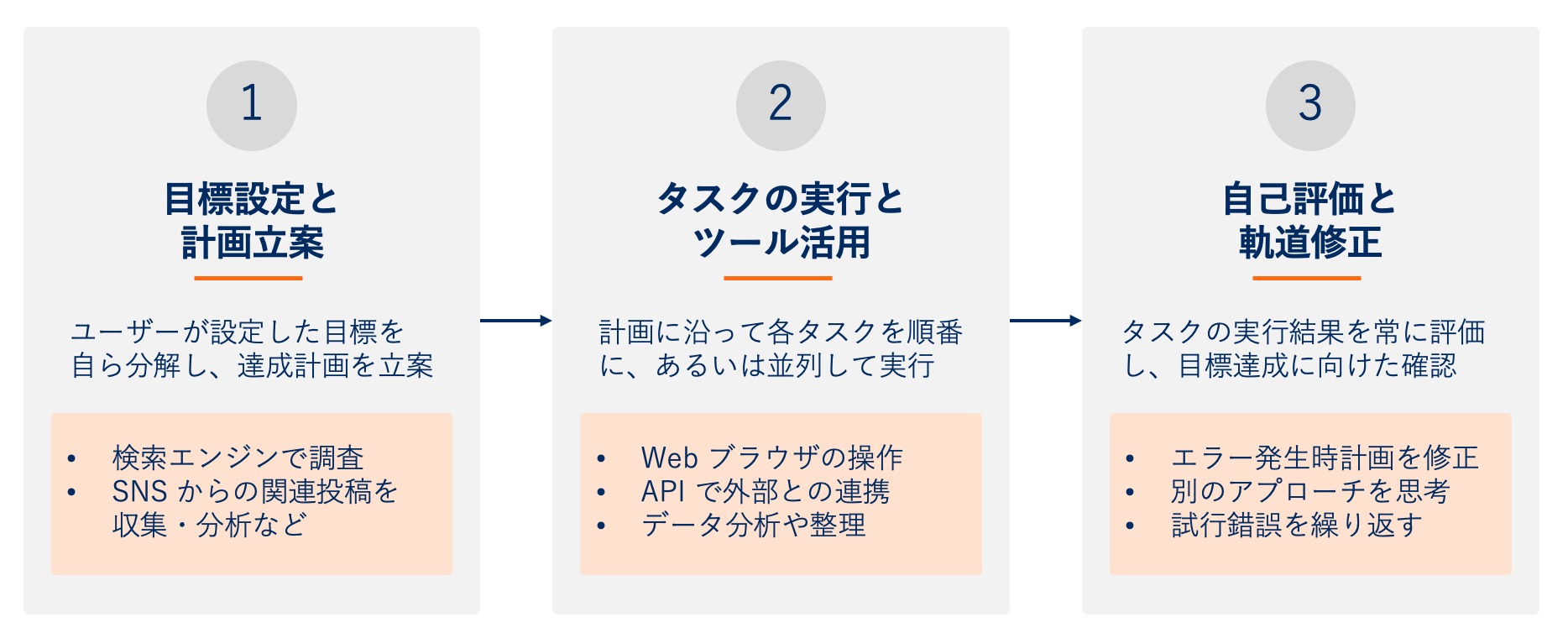 計画に沿って、AIエージェントは各タスクを順番に、あるいは並行して実行していきます。この際、Webブラウザの操作、APIを通じた外部サービスとの連携、ファイル操作など、様々なツールを自律的に使いこなします。単純な情報検索だけでなく、データの分析や整理、他のアプリケーションへの入力まで、一連のプロセスを自動で実行できるのが強みです。