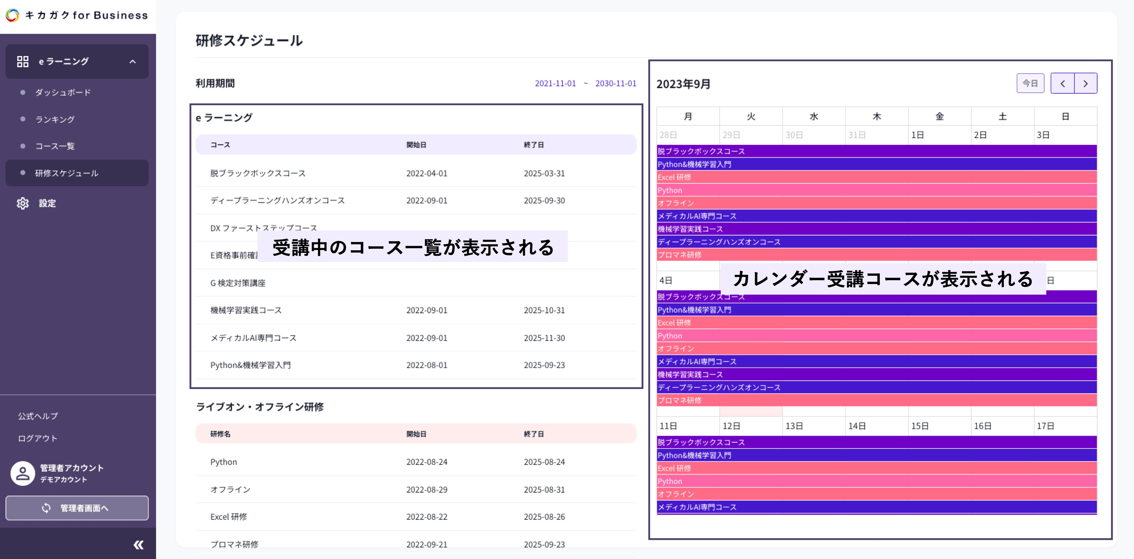また多くの企業ではライブオンやオフライン研修と eラーニングを組み合わせることが多いため、eラーニングだけでなく、その他の研修もひと目で確認することができます