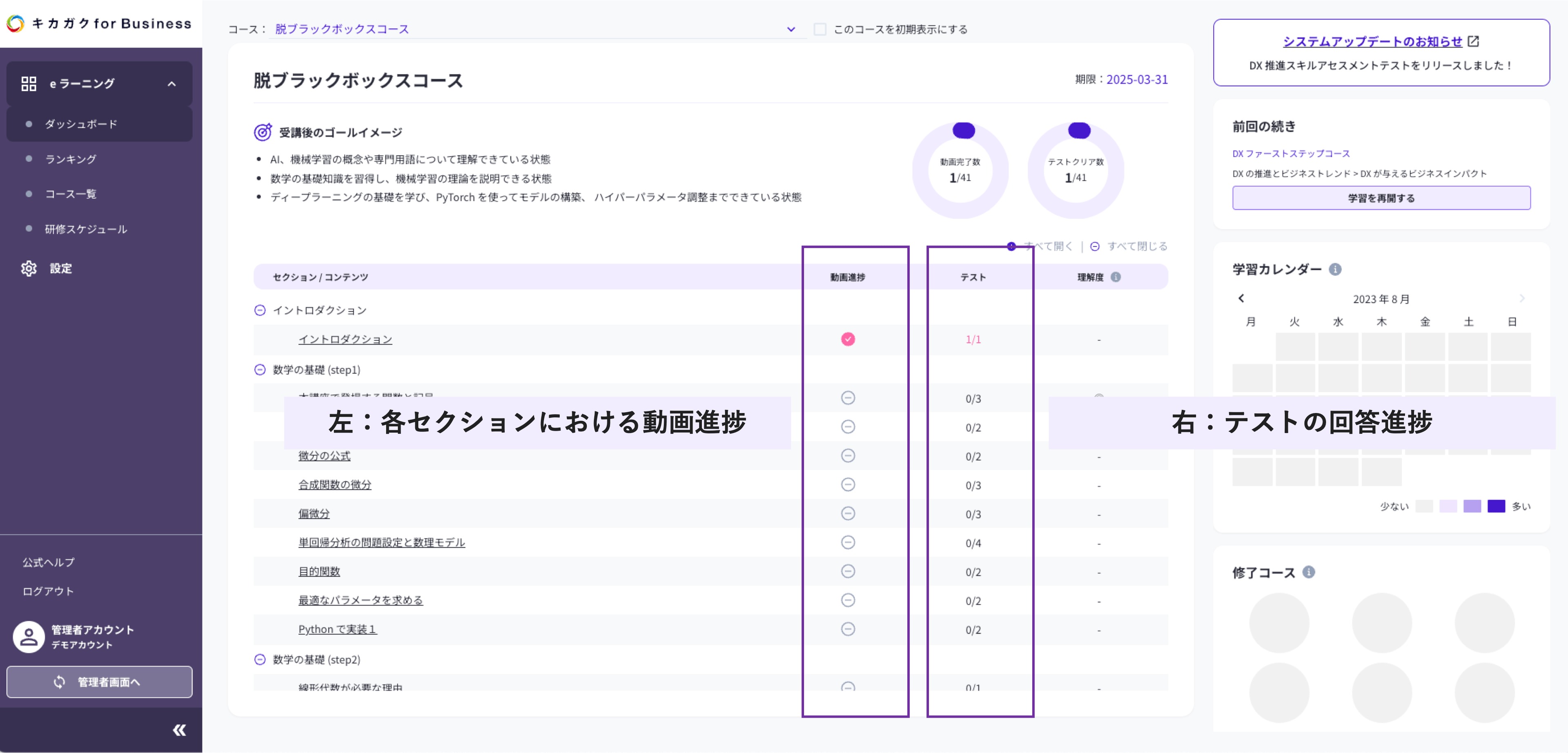 また、コースごとに動画やテストをどこまで学習完了したのか、ということがひと目でわかるものが「ダッシュボード」になります。