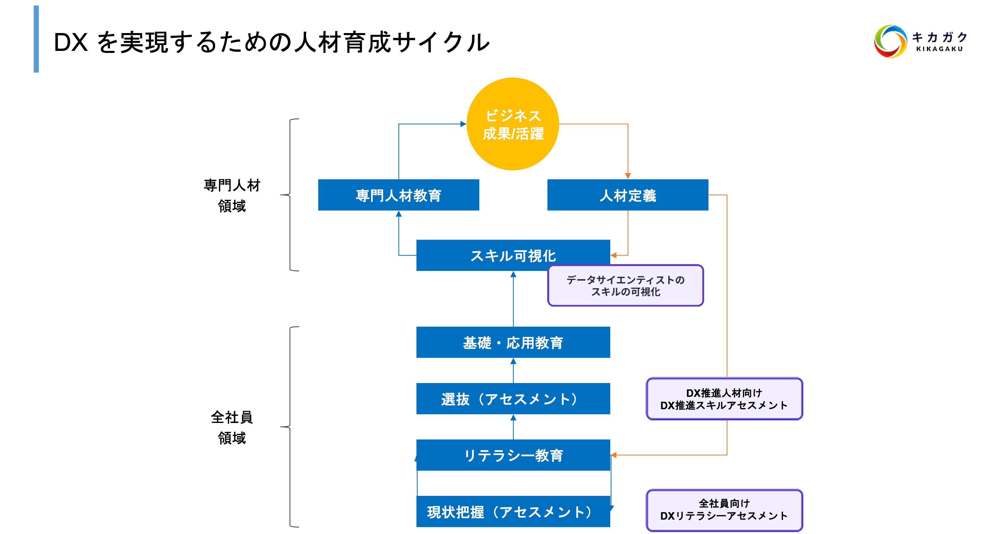 上記のサイクルを回すことで、DX 人材の育成だけではなく、DX を通して活躍できる人材の要素とそうでない要素を明確にすることができます。
